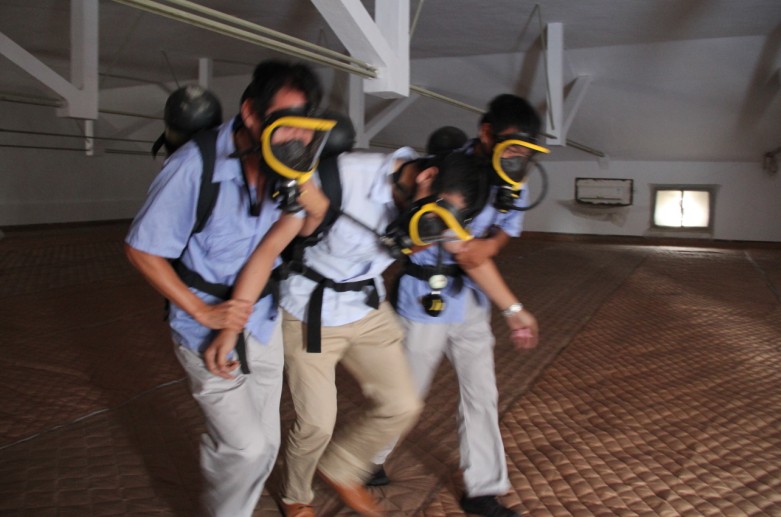 在應(yīng)急救援演練環(huán)節(jié)中,全體參演人員抽簽分成兩組,進(jìn)行實(shí)倉(cāng)演練。在演練過(guò)程中,小組人員迅速確定隊(duì)長(zhǎng)及各自分工,按照情景設(shè)定,事先安排進(jìn)倉(cāng)及倉(cāng)外守候人員,而后根據(jù)事先給予的暗簽,對(duì)需要進(jìn)行呼吸器他救的人員及時(shí)連接他救裝置進(jìn)行他救,對(duì)空氣呼吸器氣量不足等不明原因暈倒的人員在最短時(shí)間內(nèi)通過(guò)他救裝置進(jìn)行現(xiàn)場(chǎng)救援并合力“救出”至倉(cāng)外,搶救的同時(shí)安全監(jiān)督人員及時(shí)向領(lǐng)導(dǎo)報(bào)告現(xiàn)場(chǎng)情況。演練過(guò)程中,大家臨危不亂、互幫互助,做到各司其職、有條不紊。兩組人員分別在66秒、67秒內(nèi)完成演練任務(wù),但其中一組在救援暈倒人員中卻忘了連接他救裝置。全體參演人員通過(guò)親身實(shí)踐及觀摩他人演練,剖析合理做法,互相查找不足、吸取經(jīng)驗(yàn),將理論知識(shí)與實(shí)際操作進(jìn)行了有效結(jié)合。