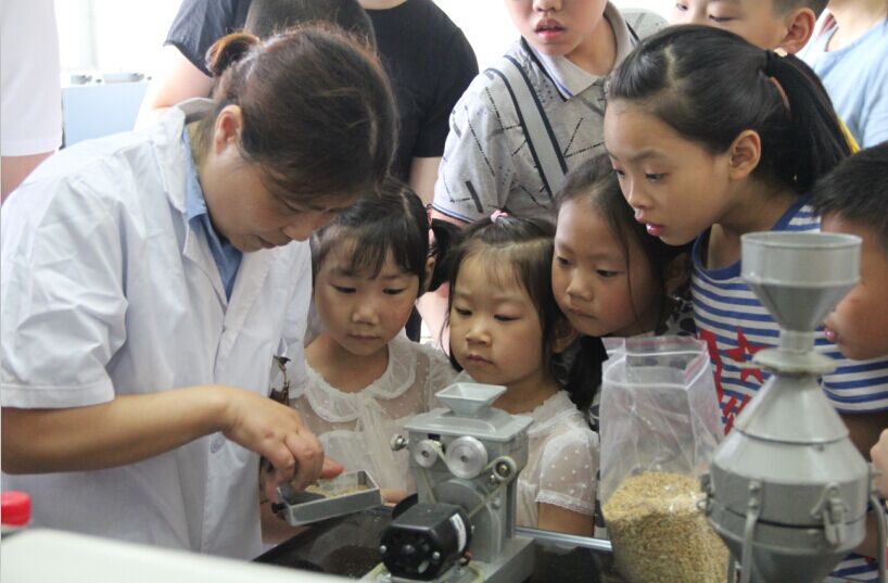 活動當(dāng)天上午9時,孩子們在老師和家長的陪同下,陸續(xù)來到公司中心糧庫,在公司工作人員的帶領(lǐng)下,興高采烈地參觀了中心糧庫,看到高大整齊的糧倉,孩子們都驚嘆不已,紛紛拿起手中的相機(jī)拍照留念。為保證孩子們的安全,工作人員帶領(lǐng)大家參觀了正值空倉期的0P30號倉,并通過觀察擋糧板、地下壟等設(shè)施設(shè)備,簡要了解了倉內(nèi)防鼠、防蟲、通風(fēng)等知識。隨后,大家來到糧庫檢驗中心,檢驗員為大家講解了小麥、稻谷、玉米等糧食品種。講解過程中,孩子們對小麥、稻谷如何變成面粉、大米表現(xiàn)出了濃厚的興趣,于是工作人員現(xiàn)場演示了面粉、大米的加工過程?粗竟葟臋C(jī)器中轉(zhuǎn)變而來的一粒粒雪白的大米,孩子們興奮得拿起來就往嘴里放,一邊嚼,一邊喊“真甜”;顒舆^程中,工作人員還向孩子們分發(fā)了糧油安全知識資料和愛糧節(jié)糧宣傳手冊,并給大家傳閱了儲糧害蟲昆蟲圖冊,以此宣傳糧油安全防范意識和愛糧節(jié)糧傳統(tǒng)美德。